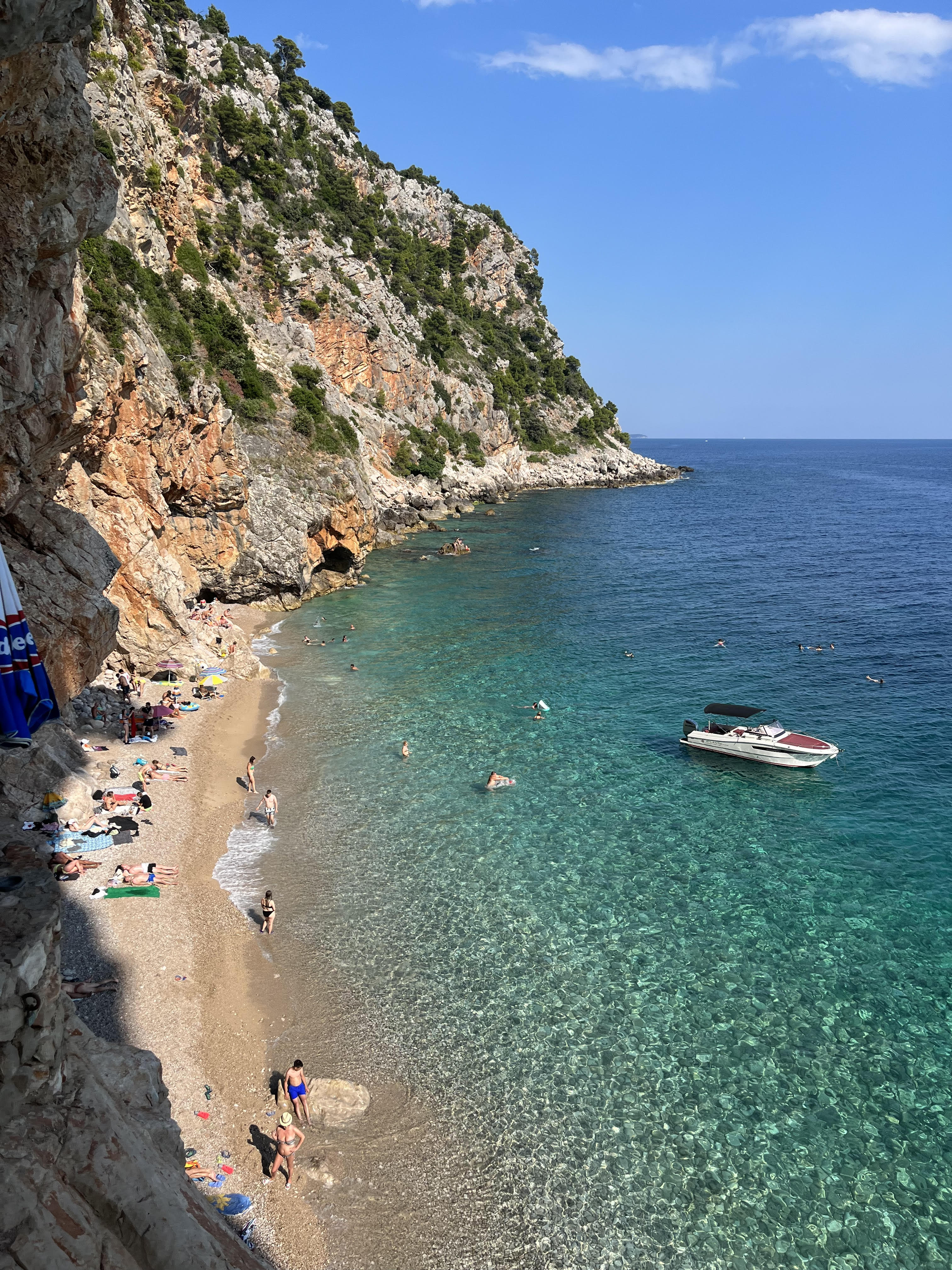 Wir fahren dann zum Strand von Pasjača. Auf unserem Weg passieren wir die Klippen von Konavle mit atemberaubender Aussicht auf das Panorama. Der Strand Pasjaca in Konavle ist einer dieser versteckten Schätze der Region Dubrovnik. Es ist einer der schönsten Strände an der Adria. Er wurde 2019 als bester europäischer Strand ausgezeichnet. Er liegt in dem kleinen Dorf Popovici, so ziemlich im Herzen der Wildnis von Konavle. An manchen Stellen ist es sandig, aber die Kieselsteine sind weich unter den Füßen und das Meerwasser ist fast durchscheinend.